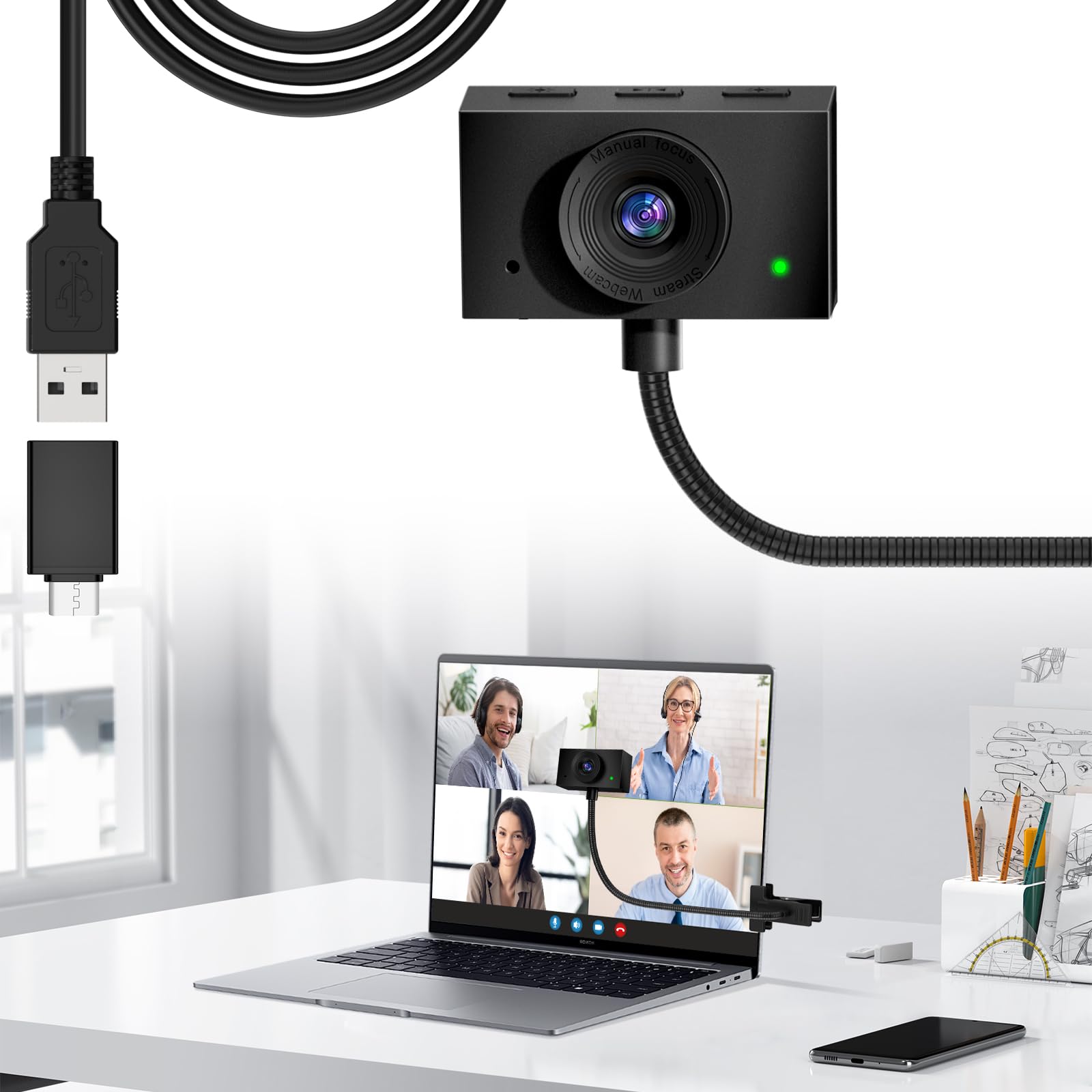 The Majiphi Eye Contact Webcam is a perfect solution for anyone wanting professional-looking video calls with its flexible positioning and crystal-clear 1080p resolution.